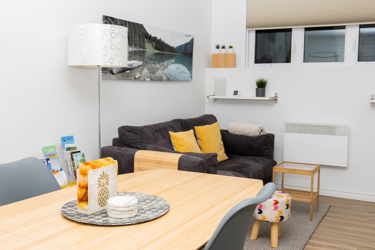 Click on our logo to see all our properties and choose the ones that suit you best! Design and spacious apartment ideally located in a popular area of Quebec City just steps away from the historic downtown area. The apartment is equipped to accommodate 2 people (one queen-size). Wifi, TV, Nespresso machine, washer/dryer, dishwasher, microwave, and air conditioning are included. Linens and towels will also be provided. For more information, kindly read the detailed description below. :)