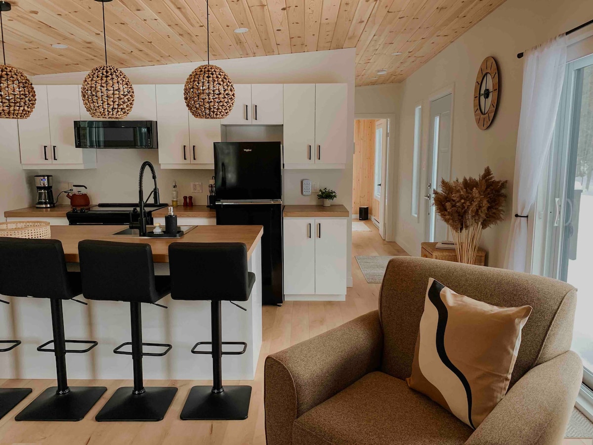 MAISON NEUVE—À quelques pas du restaurant Le Bootlegger, cette magnifique maisonnette, vous offrira sérénité et calme plat avec votre famille ou amis (max 4 pers.). Avec ses accents de murs en bois intérieur, vous trouverez modernité et quiétude. À moins de 15 minutes du centre ville de La Malbaie. Notre maison, a été entièrement pensé et bâti de nos propres mains (ou plutôt mon conjoint entrepreneur hihi). Attention - le terrassement extérieur sera bientôt effectué (pelouse). CITQ : 306556