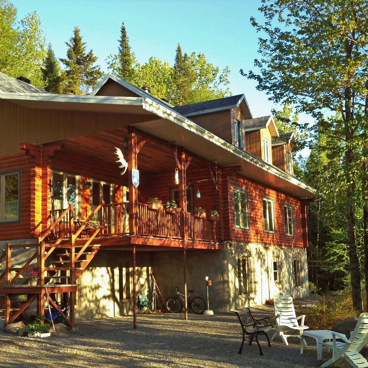 Comme une suite a l'hôtel, grande chambre privée avec petit salon et salle de bain complète. Insonorisée et climatisée, vous dormirez comme des bébés. Le cable et les canaux spéciaux, ainsi que le Wifi haute vitesse vous sont offerts. Également offert, un petit déjeuner pour commencer la journée. Maison ou il fait bon vivre, entourée de la nature boréale. Nous sommes a quelques minutes des grands artères. Grand terrain aménager en permaculture.