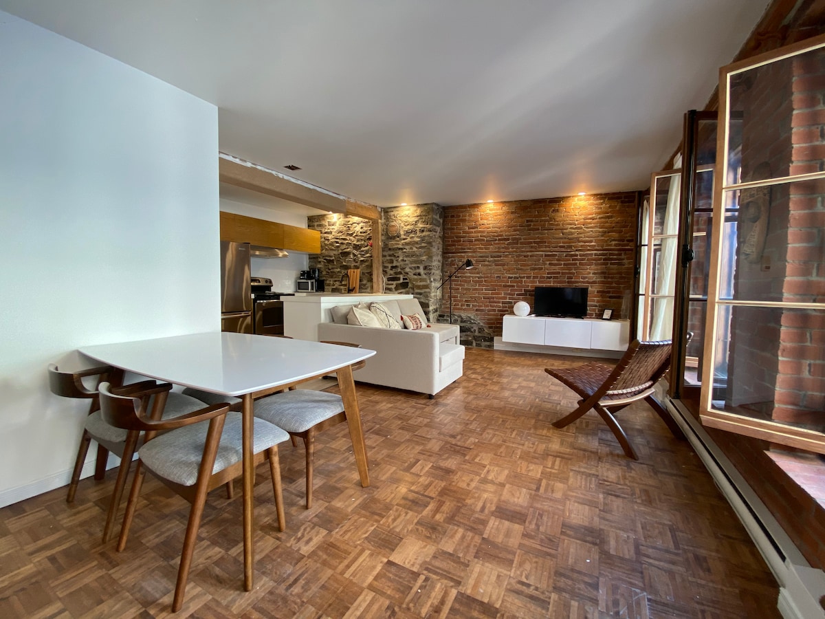 STATIONNEMENT GRATUIT À 1 minute À PIED DE L’APPARTEMENT Terrasse privée Au coeur du Vieux-Québec, à 5 minutes à pied du Château Frontenac, fraîchement rénové et allie l'architecture ancestrale typique du Vieux-Québec avec le confort du moderne dans un édifice construit en 1860. Profitez du soleil sur la terrasse ou ressourcez vous dans notre appartement calme et lumineux avec des murs de pierres ancestrales et briques. Terrasse privée. *la rue est dans une zone piétonne durant l’été*