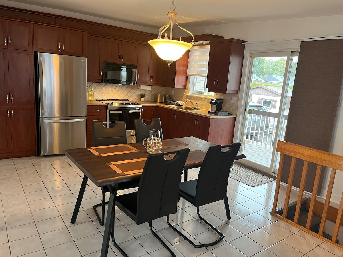 - Appartement de 3 chambres à coucher, tout près de l’aéroport. - 2 stationnements gratuits - Emplacement idéal à proximité de plusieurs services (restaurants, transports en commun, magasins) - À 15 minutes en voiture du Vieux-Québec ou accessible par transport en commun au coin de la rue - Propriétaires au sous-sol sol de 9h00 à 17h00 sur semaine (commerce) - Commodités: Wifi, câble Diablo avec les plus récents films, air climatisé, télévision 55 pouces et beaucoup plus. - Entrée avec code
