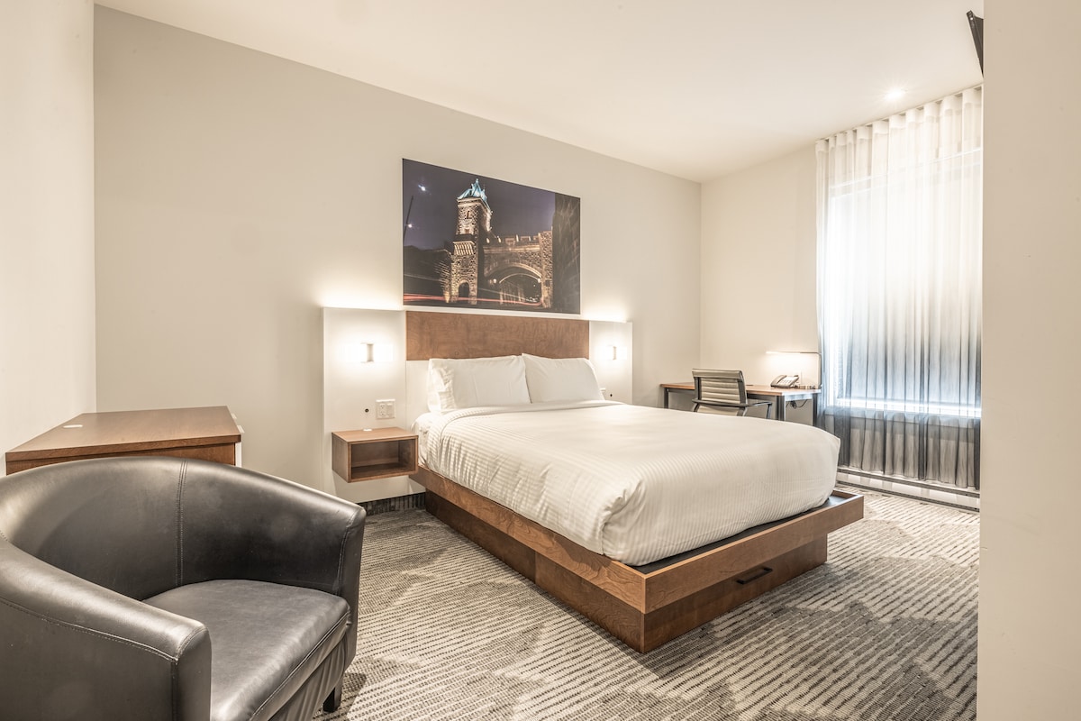 Nos chambres lit Queen sont parfaites pour deux personnes désirant confort et économie. Plusieurs d’elles sont adaptées pour personne à mobilité réduite*. Elles sont aménagées de tout ce dont vous aurez besoin pour un séjour parfait. Son lit haut de gamme et son mobilier fait sur mesure de fabrication québécoise sauront vous ravir.