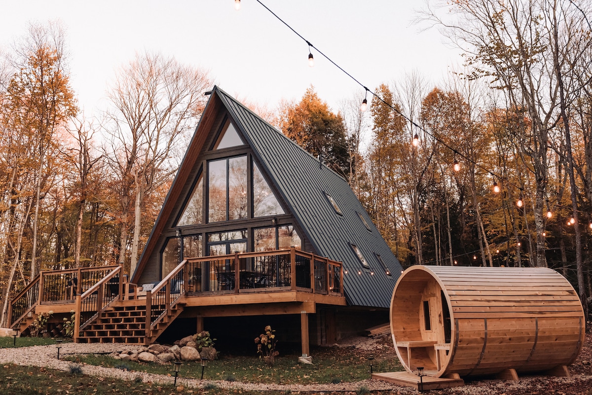 Nestled on 6 private acres the a-frame is perfect for nature enthusiasts, couples, and friends seeking a weekend retreat. The Estonian-designed cottage blends luxury with rustic charm, featuring 3 bedrooms, 2 bathrooms and a fully equipped kitchen. Unwind in the barrel sauna or gather around the fire pit under the stars. Discover a small public beach, boat launch and dock within walking distance. Explore local distilleries, breweries, and shops or adventure into nature for countless activities.