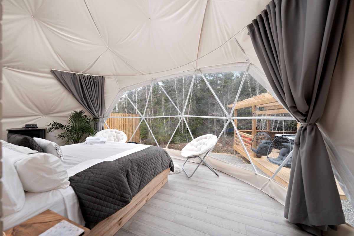 Indulge and unwind in our brand new fully loaded luxe Glamping Dome! We added a little touch of luxury, and rustic camp feel. Enjoy your stay! During your stay, you will have private access to Canada’s fanciest top-line Hot-Tub spa, the Hydro Pool Model 395 CLIMATE🌞❄️ This Dome is equipped for any sort of Canadian climate! Featuring a Mini Split for Heating/Cooling, & Heated Flooring (not in use during summer times) for those brr cold winters