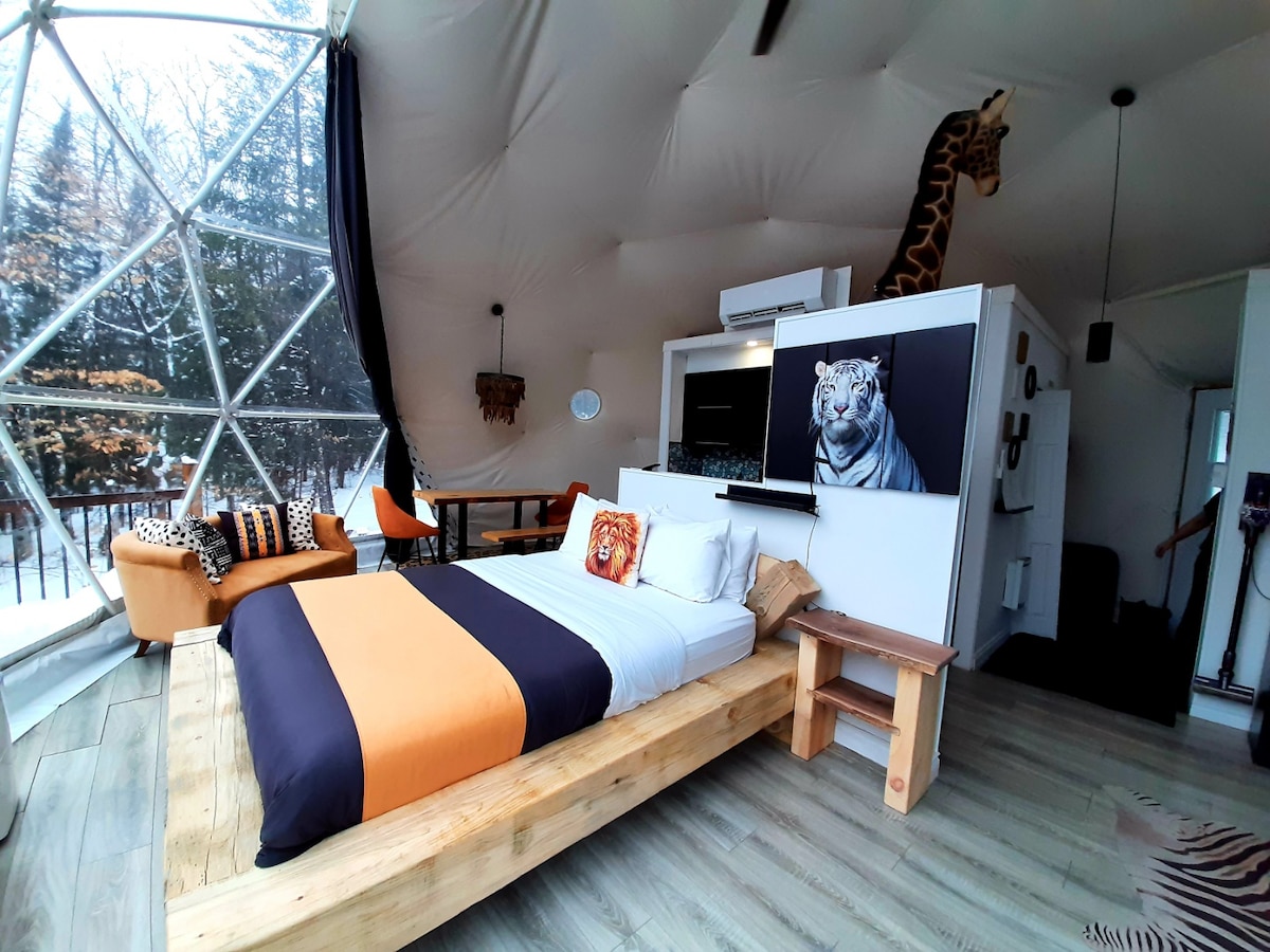 Domaine Rivière-Rouge Dome SAFARi avec spa. Bord de l’eau, wifi, kayaks, paddel board et chaloupe inclus. Spa ouvert à l’année, feu extérieur apportez votre bois. Safari vous propose une expérience unique en Amérique du Nord. Le dôme SAFARI 4 Saisons un endroit à ne pas manquer. Notre site offre l'opportunité de vivre une expérience luxueuse en parfaite symbiose avec la nature et l'environnement. Situé à 25 minutes de Mont tremblant. Pas d’animaux d’autorisés.