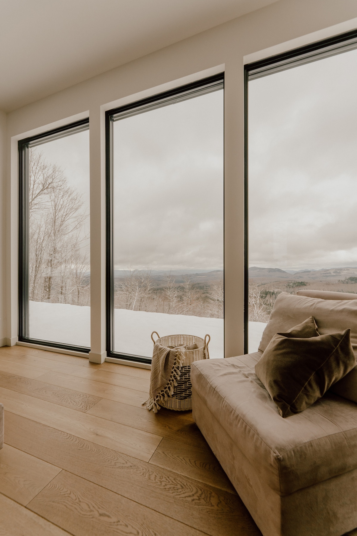 Our Nordic forest chalet is perfect for spending quality time as a couple (or with a kid), or for a work-retreat (with high-speed WiFi). The wooden interior is warm and cozy. The full-height windows offer stunning views over a forested valley. The open-concept kitchen and living room keep you in the conversation while cooking. If you prefer to cook outside, there is a fire pit with a grill and outdoor dining table. Only 70-min drive from Montreal. The lake is a 25-min walk if you park nearby.