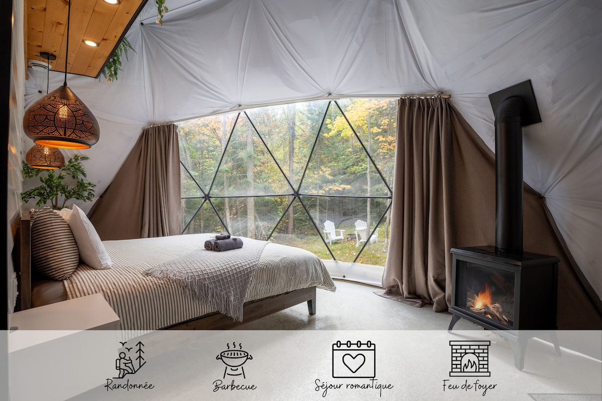 Visit our Airbnb profile to see the listings of our 6 private domes :) Welcome to Gîte l'Évasion! Experience sleeping under the stars in the comfort of a queen bed, in the wonderful Lake Superior region. ✲ 25 minutes to Tremblant ✲ Private 4-season spa ✲ Indoor Gas Fireplace ✲ Fire pit ✲ Private terrace with BBQ ✲ Footpath ✲ Private shower ✲ Full kitchen ✲ AC ✲ Included: Bedding, towels, sanitary and food essentials
