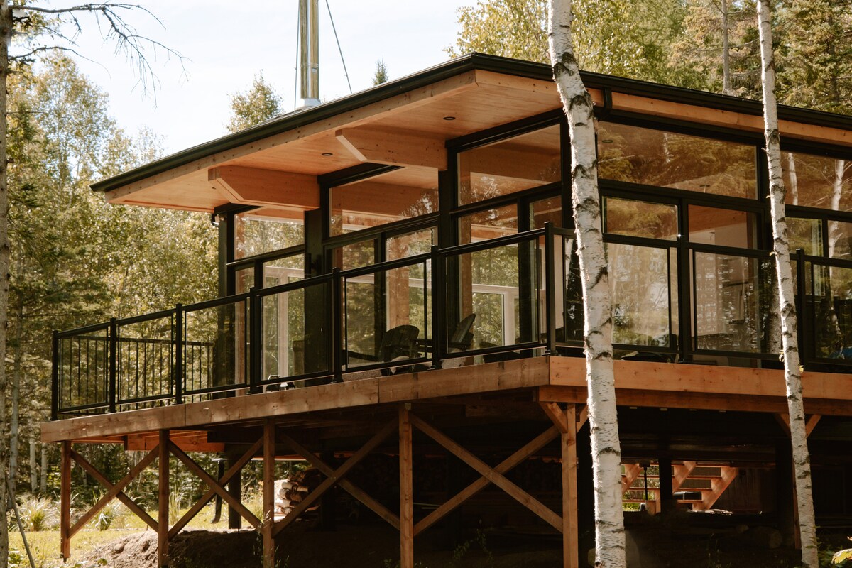 Escape to ROCKHaüs, a stunning modern chalet in the Laurentian Mountains near Mont Tremblant. This 3-bedroom architectural gem comfortably fits 8 guests. It features a panoramic glass dome sauna, a built-in hot tub, and breathtaking mountain views. Perfect for a luxurious retreat, it offers a unique blend of contemporary design and natural serenity with a cozy Scandinavian fireplace and expansive outdoor deck. Experience an unforgettable getaway with high-end amenities and private lake access.