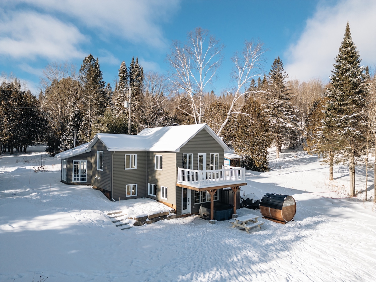 The Serenity is a new construction located within the Lac Gérard estate. This chalet can accommodate up to 9 people. Only 1 hour from Montreal, it’s perfect for a family getaway. This modern-style chalet offers splendid natural light, relaxing decor, an open-concept main area, a spa, and a dry sauna. High-speed internet ensures a stable connection for remote work, making it an ideal environment for a “workation.” CITQ: 311831
