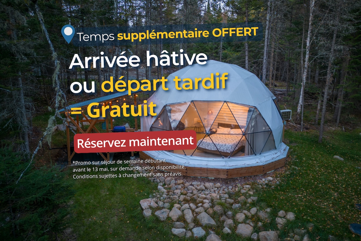 Visit our Airbnb profile to discover our 6 private domes! : ) Welcome to Domaine l'Évasion! Enjoy a romantic getaway under a starry sky. Relax in your private 4-season spa, nestled in the heart of a coniferous forest, lulled by birdsong. ★ 25 minutes to Tremblant ★ Private 4-season spa ★ Indoor Gas Fireplace ★ Fire pit ★ Picnic area with BBQ ★ Hiking trail ★ Private shower ★ Full kitchen ★ AC