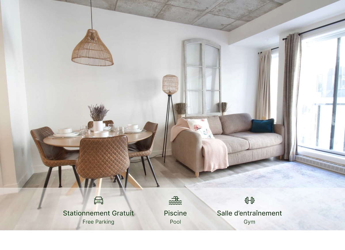 The 1106 is the novelty of the St-Roch district which is in full effervescence. In addition to the indoor gym, a heated swimming pool** is located on the roof surrounded by a magnificent terrace with a view of Old Quebec. The 1106 is a comfortable condo with King bed and Queen sofa bed in a fresh and cared decor. Everything is there for a perfect stay: air conditioning, washer/dryer, dishwasher, sheets and towels are also at your disposal. The ideal location for visiting Quebec!