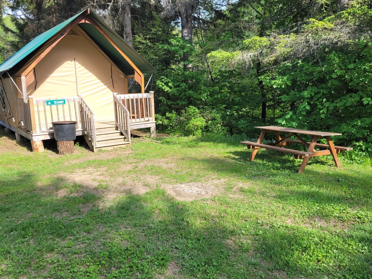 Venez vivre une expérience unique! Située à l'orée d'une érablière centenaire, notre nouvelle tente vous offre une vue de 180 degrés qui s'étend jusqu'aux Adirondacks. Par temps froid un foyer à combustion lente vitré vous tiendra bien au chaud et vous offrira une belle luminosité. Vous pourrez cuisiner à l'extérieur où tout le matériel nécessaire est à votre disposition ou bien acheter nos repas fait à base de produits locaux, que nous vous servirons à la tente.