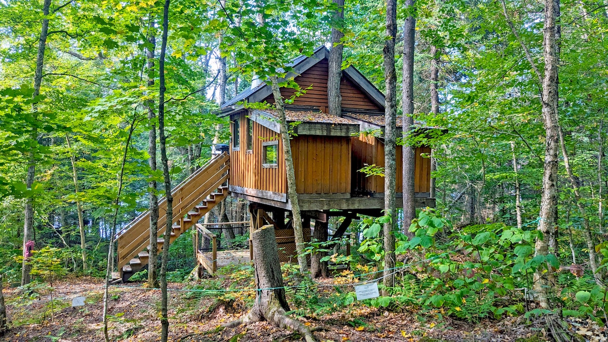 Welcome to Treetop Rentals and Farmstead Nestled high up in the trees and surrounded by hundreds of acres of forest, this is a stay you are certain not to forget. With a 3 piece bathroom, hot water and a full kitchenette, this treetop stay will not ask you to sacrifice any of the comforts you look for. Come and recharge with the calm quiet of nature, warm yourself by a campfire and enjoy a spectacular view of the night sky.
