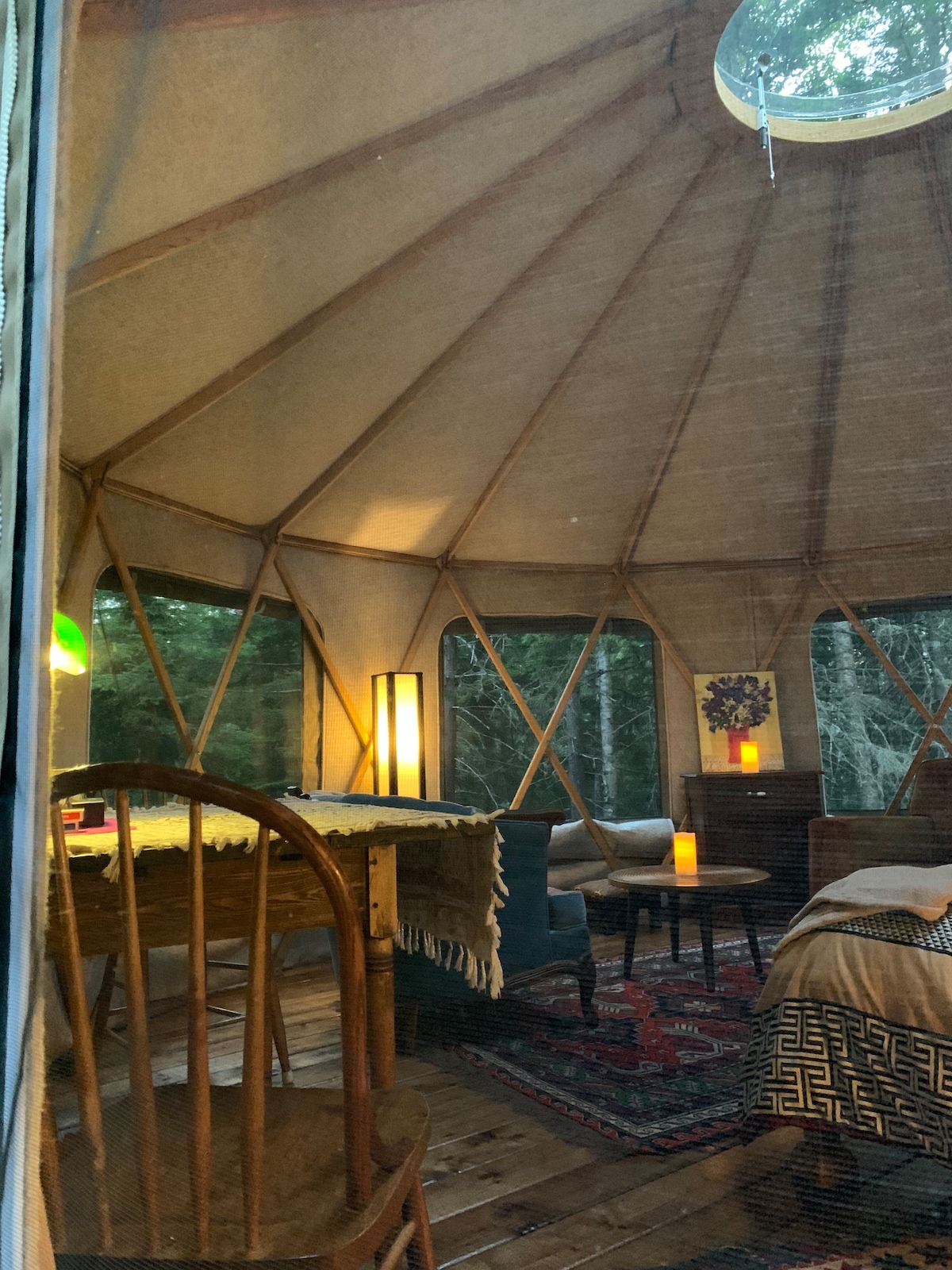 Summer season open from (May 8 - Oct 31, 2026) and Winter Season (Jan-April weekends only). We offer one night stays! Enjoy this secluded off grid (solar powered) cosy yurt, eclectic furnishings - situated in a private forest environment. On the deck a BBQ with cooking utensils and patio set are provided in summer - no water during winter season (Nov-April 30) - a small chemical toilet is provided. Enjoy the comfortable simplicity and relax in nature; sauna service available 50$.