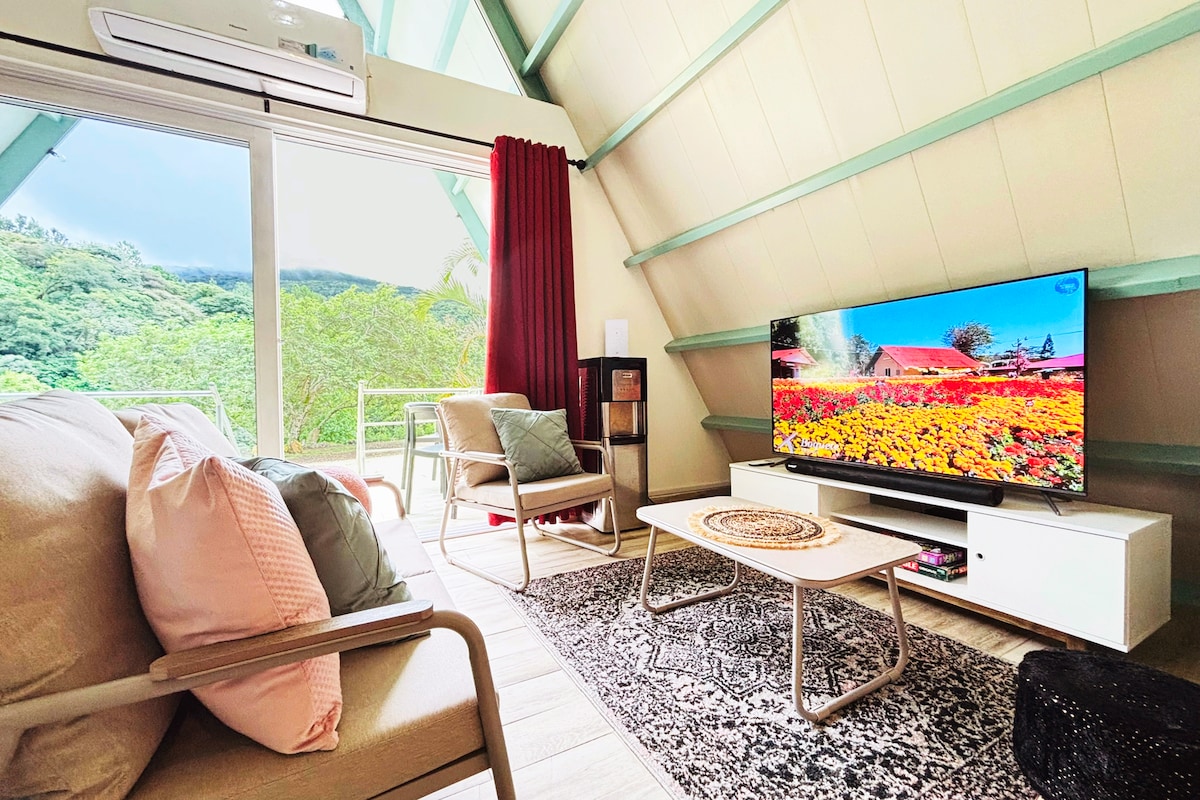 From the 200 sq. ft. open shared terrace on the middle floor, savour your coffee while enjoying the highland getaway and the unique view of the quaint town of Boquete. The loft next to it, has a full kitchenette basic appliances, a small living, dinning and laundry area. The “Butterfly Sanctuary” has a large closet and a double bed. The “Hummingbird Haven” has a queen bed and a LED TV with cable. WiFi: 250Mbps. Access to the loft, terrace and bedrooms is through outside stairs.