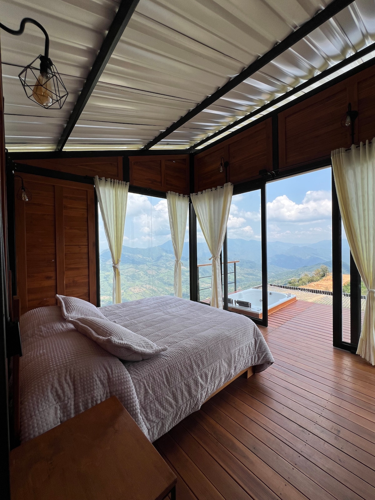 "Suite entre los árboles", diseñada por el artista Denis Aleksandrov. Cama queen, área social, cocina equipada. A 1700 metros, en la cima del cerro , la casa de autor ofrece vistas panorámicas hacia El Tablazo y los valles de San Francisco, la Vega y Gualivá. Con suerte, divisarás el Parque de los Nevados y la fumalora del volcán Nevado del Ruiz. Clima cálido y noches frescas y sin zancudos.