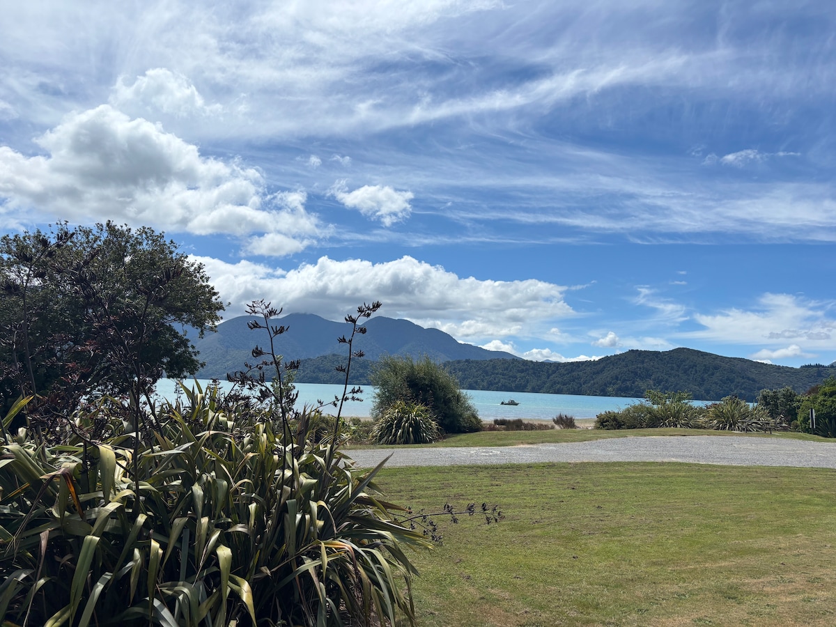 Brand New 3brm holiday home with large deck, stunning sea views overlooking the Marlborough Sounds. The sea is 1 min walk.Free Wifi, kayaks, bbq, childrens swing and outdoor blackboard. 10 mins drive to Havelock, 25 mins to Picton along the world renowned Queen Charlotte Drive. 40 mins to Blenheim. The wineries are 20 mins away. Havelock is the Green Shell Mussel capital of the world. Restaurants, a four square supermarket, cafe, galleries, marina and scenic cruises are located here.