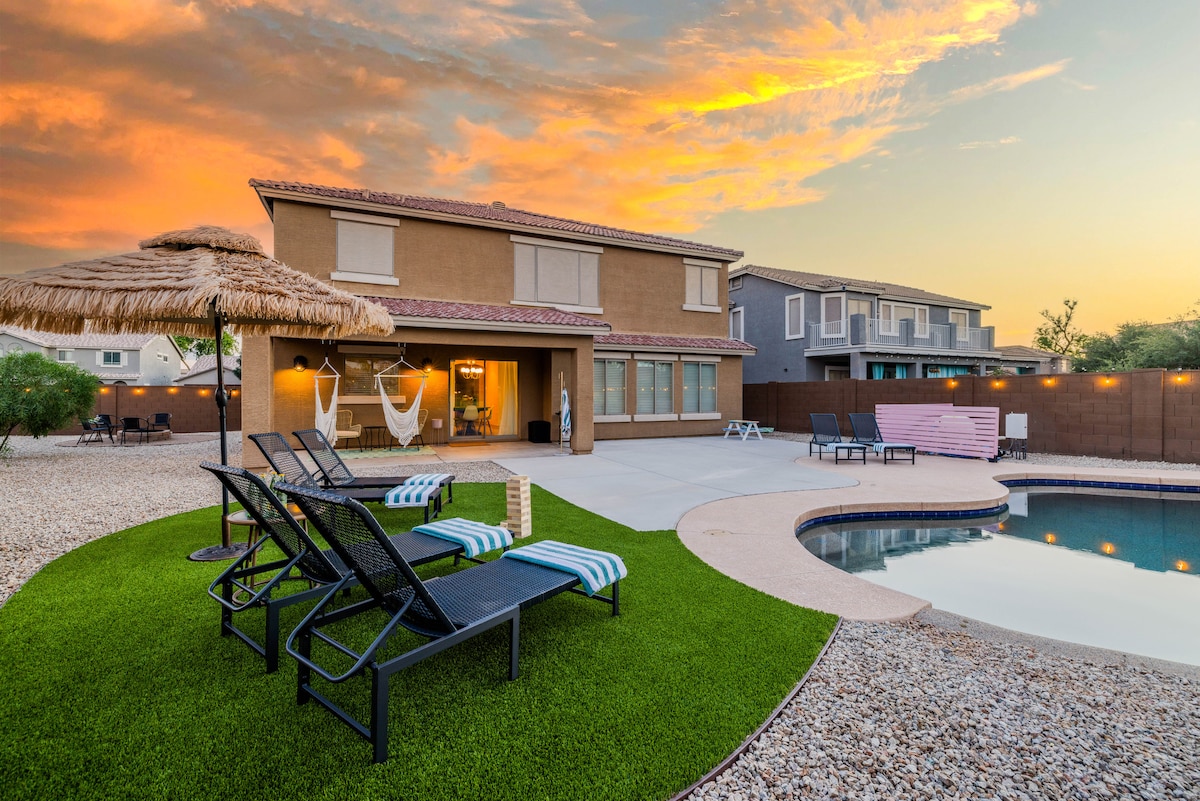 Desert Oasis w/ Private Pool (not heated), BBQ area, full kitchen, King Bed w/ Tempurpedic Mattress in Master w/ walk-in shower, large tub and handicap handles in each bathroom for your convenience. Walking distance to PARK, 4 miles to GOLF COURSE, less than 5 miles to SCHNEPF FARMS w/ PETTING ZOO, 3 Miles to FOOD and SHOPPING, 12 miles to LEGACY SPORTS COMPLEX, 29 miles to SALT RIVER TUBING. 4 Bedrooms, 3 Full Baths, Pack n Play, WiFi, Cable TV, AC, colorful areas for great selfies.
