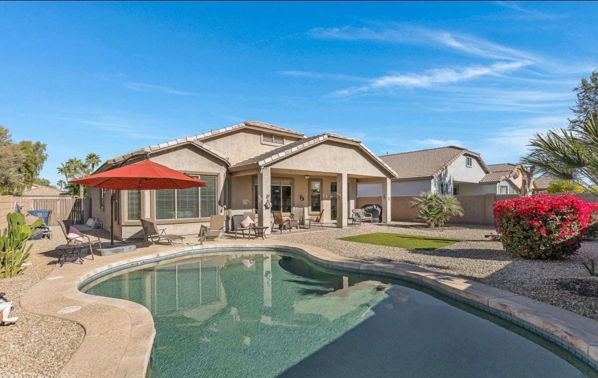Gilbert Downtown famous restaurants are close by. This house is truly an entertainment paradise. The thought put into the theming will surprise you. Backyard features cornhole game, air hockey table, fire pit, BBQ, Swim Spa, Hot Tub, string lights, seating area pergola & much. Three bedrooms, 2 king beds and 2 full size beds. Large flat screen TV's, fireplace, family room, dinning, living room, arcade room, 2-1/2 bathrooms, washer & dryer, outdoor counter tops, quartz counter tops.