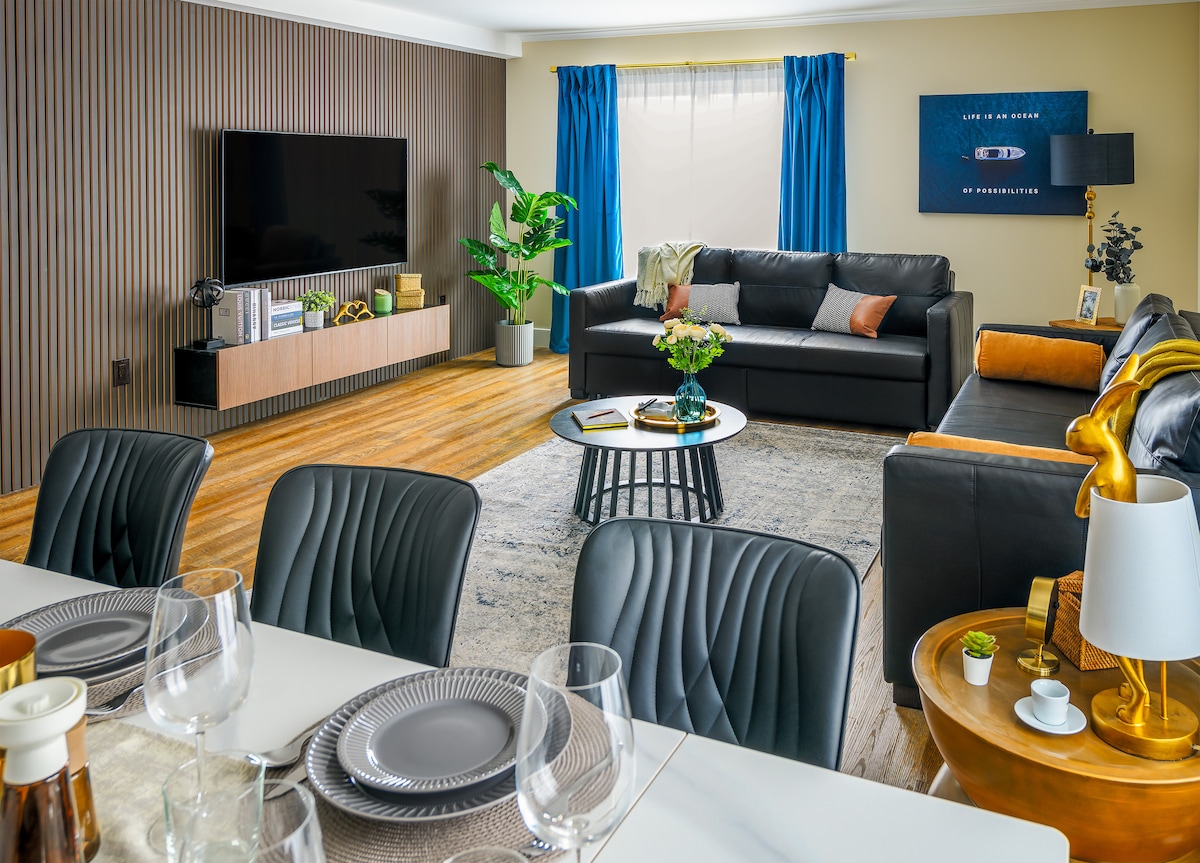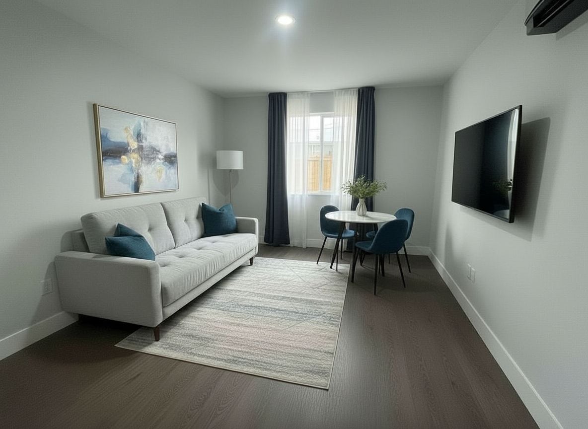 Step into this Luxurious Residence, meticulously crafted by a top-tier luxury hotel designer. This spacious retreat features 2 bedrooms (with 3 beds), a stylish Jack-n-Jill style full bathroom with double sinks, a cozy living room, a fully equipped kitchen, dining, span over generous 1200 sqft. Tailored for those seeking a temporary haven, whether for business or leisure, ideal private getaway for you and your family, its prime location ensures easy access to nearby attractions and amenities.