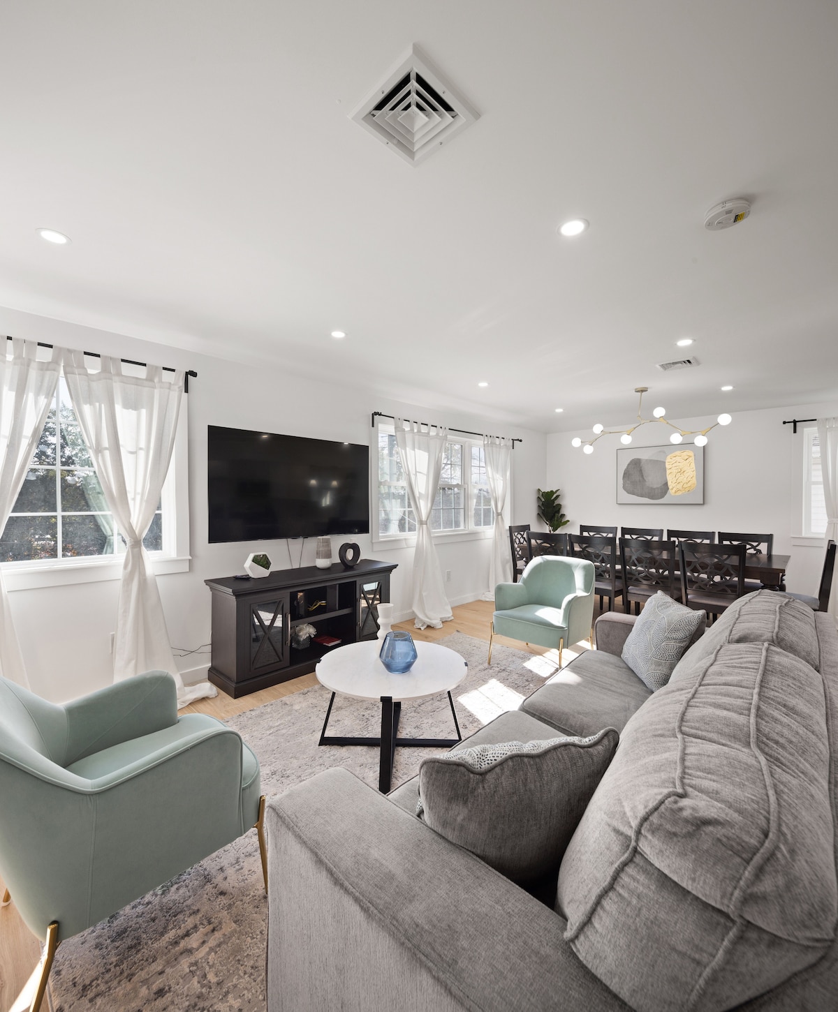 The Serenity Suite is a functionally designed, open concept, lower level space with its own PRIVATE entrance, kitchen, bedroom, bathroom and seating areas. With a clean contemporary design and furnishings, The Serenity Suite provides a cozy, serene and safe environment. Unwind and relax, in this newly renovated suburban Suite located 10 mins. from the UBS Arena and Belmont Park, 5 mins from the Belt and Southern State Parkways, 15 mins from JFK, 10 mins to LIRR and 25 mins to LGA.