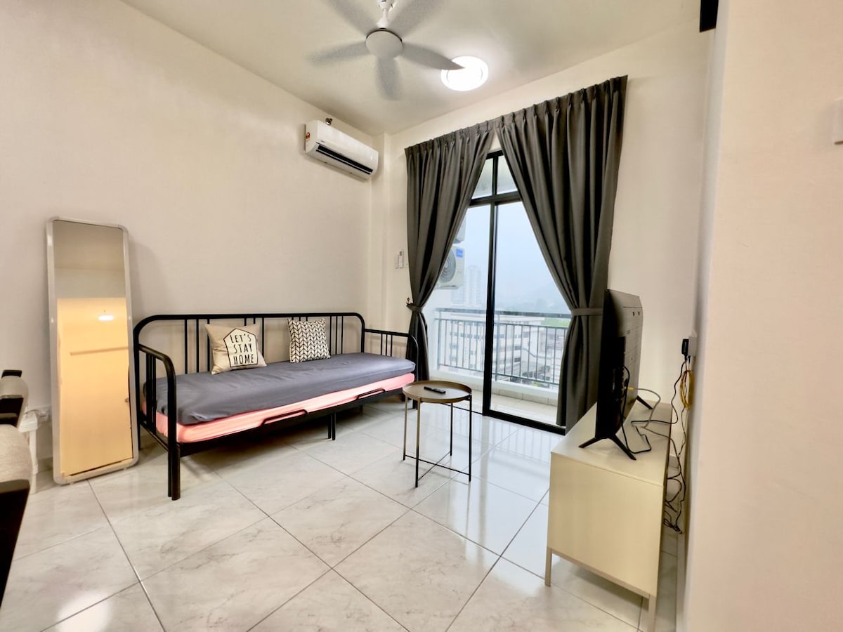 Enjoy a stylish experience ★ 1Queen Size Bed + 1Single Size Bed ★ WiFi TV provided ★ Driving duration: 5min to Queens Bay Mall, 5min to Free trade zone, 5min to Pantai Hospital ★ Free Car Park ★ Easy Check in and Check Out at this centrally-located place.