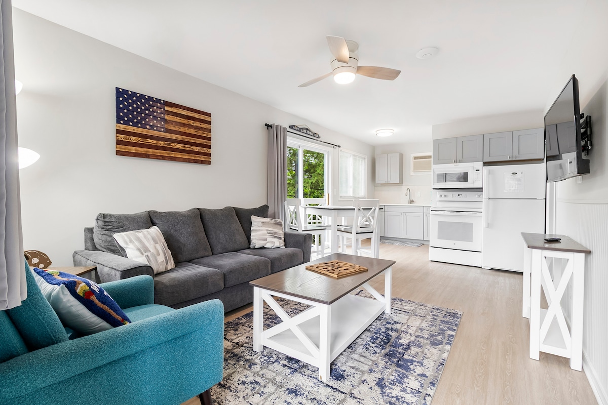 Features covered porch with great lake views. Living room and full kitchen. Master bedroom features one queen . Second bedroom has single over full bunk beds. Bathroom is equipped with tub/ shower. All of our accommodations include fully equipped kitchens, complete with dishes, pots, pans, toasters, coffeepot and microwaves