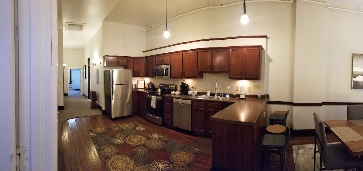 This is one of the nicest units I rent. The space is in an historic renovated building in downtown Fair Haven, VT. The space was originally used to manufacture shirts. I have divided the 1600 square feet into a two bedroom loft. It has very high ceiling and windows. It is very spacious and has been completed updated. The loft has it's own kitchen (not shared) and it's own lock and key. Since it is on the third floor of the building, it is very quiet and secure.