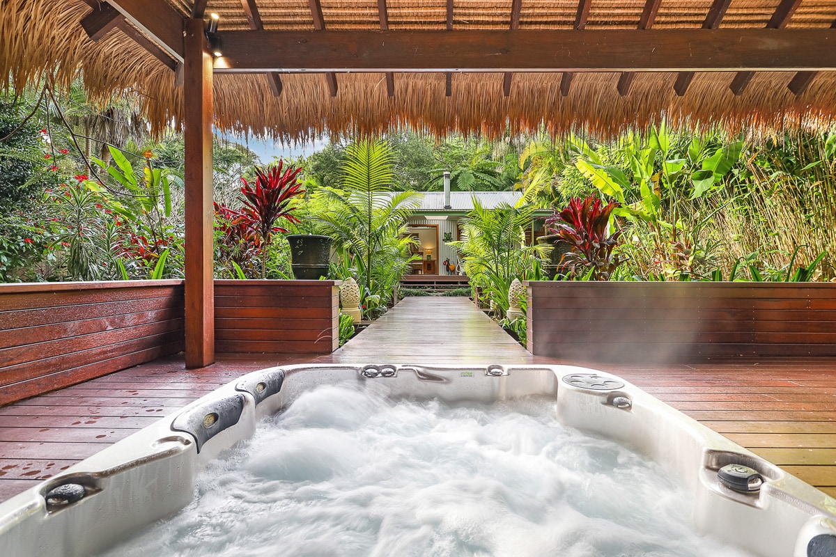 Beautiful spacious ultra modern cottage set in 5 acres of exotic sub tropical botanical gardens with natural pockets of rainforest and creek, where you can forget yourself and simply be. A stunning, fully fenced private space for up to 4 people to relax and enjoy the peacefulness of the surrounding Balinese water Garden and your own private plunge pool and 5 person hot tub in a beautiful gazebo. Totally peaceful space, but only 15 minutes to Mullumbimby, Brunswick Heads and ocean beaches