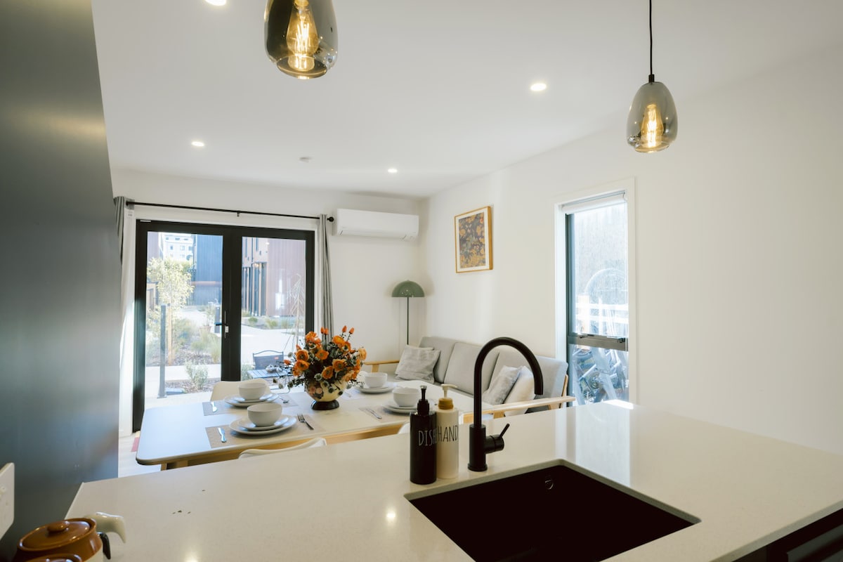 Escape to breathtaking views of the Remarkable Mountains and Kawarau River in this brand-new 2-bedroom apartment. With an ultra-super king bed (convertible to a small double & single) and a flexible additional sleeping area, comfort and versatility await. Enjoy modern amenities, a spacious layout, and serene surroundings, perfect for couples, families, or small groups. Whether relaxing inside or exploring Queenstown, this retreat offers the ultimate blend of luxury and nature.
