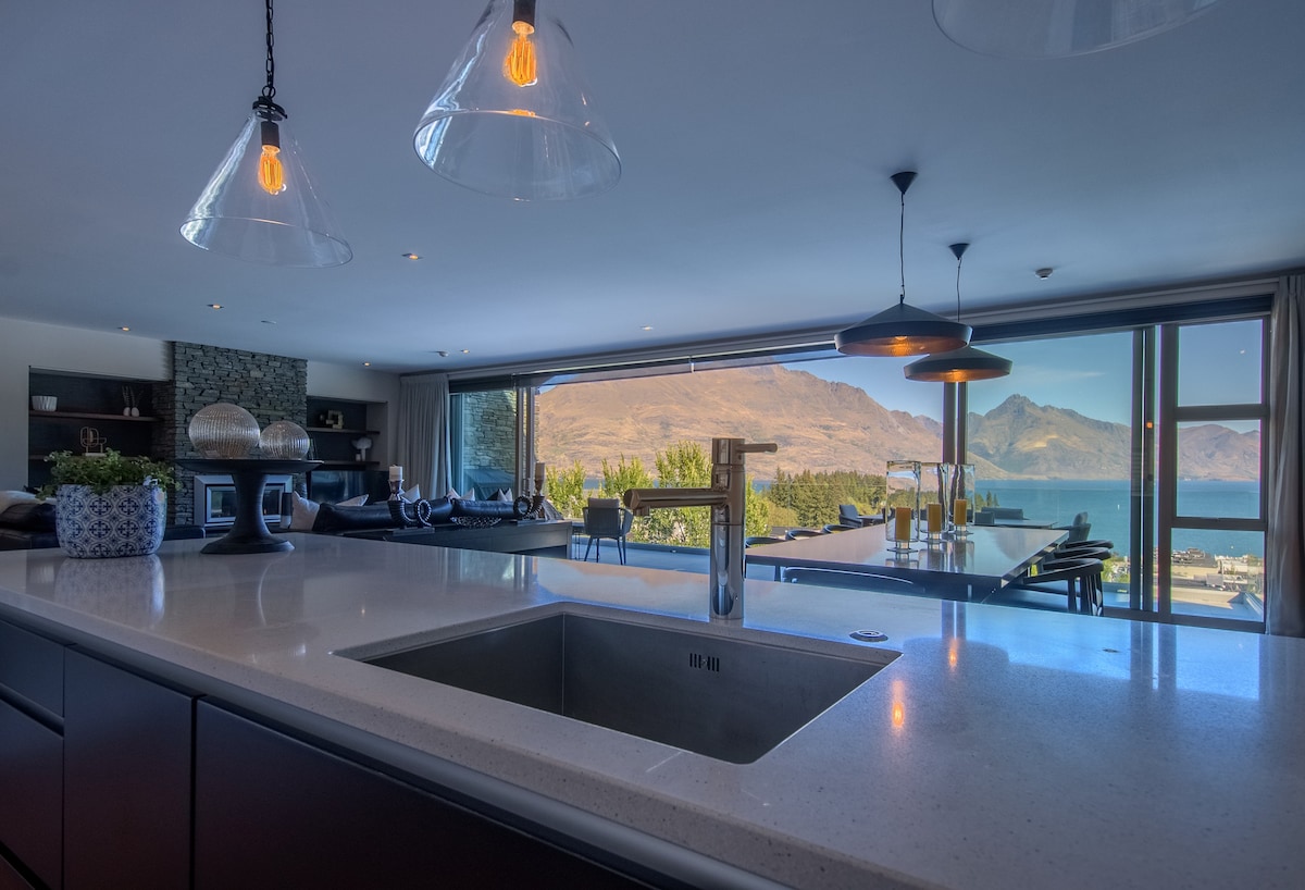 The Highlander depicts modern luxury, set atop Highlands Close . Stylish interior, stunning art...a perfect haven to relax and unwind. This Eco friendly space encompasses views of Lake Wakatipu and the surrounding mountain areas. Perfectly located between Queenstown airport (4 mins) and downtown Queenstown (5 mins). Luxury style and amenities, treat yourself while you are in one of the most beautiful places in the world. Parking is at the front door.