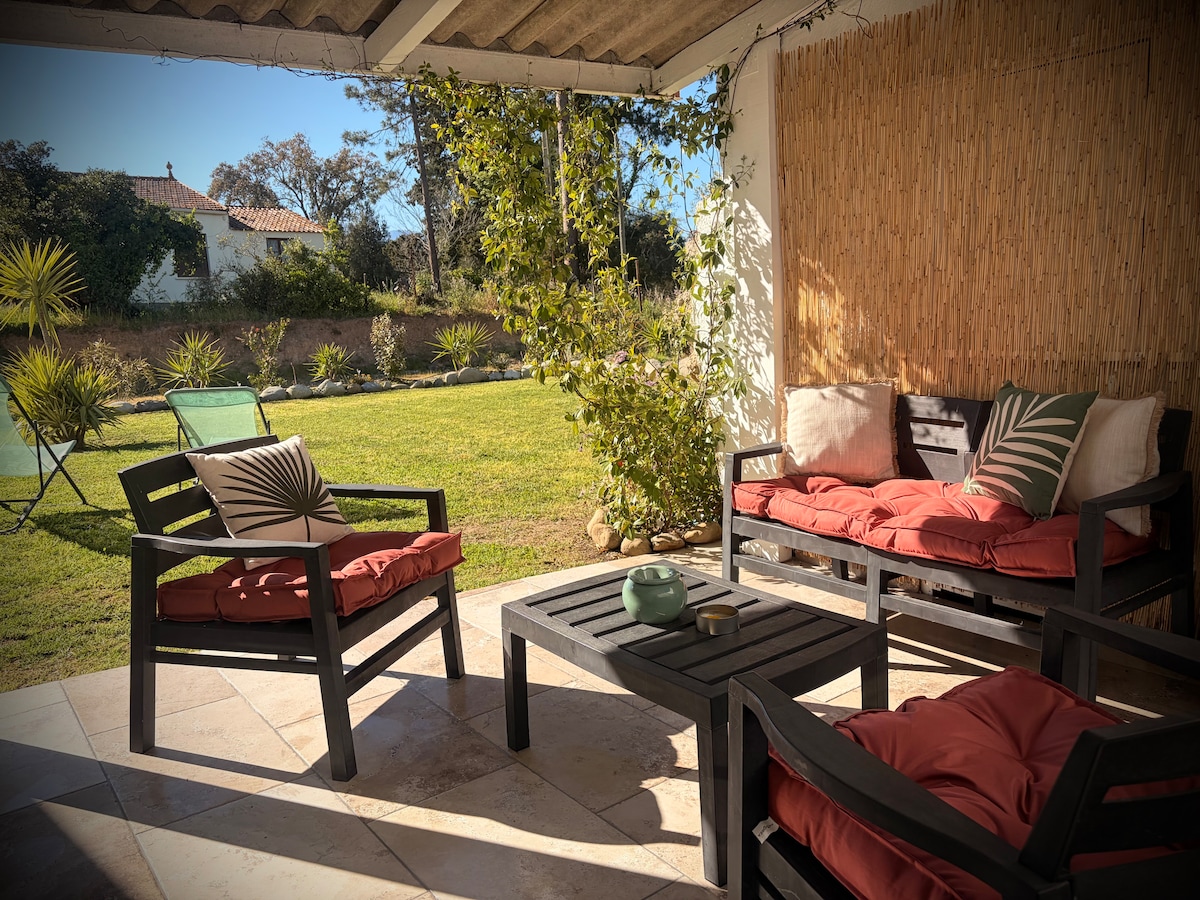 Notre logement offre une magnifique vue sur la montagne. Vous partagerez avec nous une piscine de 6X3M. La plage est accessible à pieds. Totalement rénové par nos soins, avec une décoration unique et raffinée. Vous disposez de 2 lits individuels dans la chambre et d’un divan lit 140X190 dans le séjour. La terrasse est équipée de fauteuils, table, chaises, barbecue. Isolés dans un immense jardin vous y serez au calme absolu. Vos enfants et animaux pourront y circuler en toute sécurité