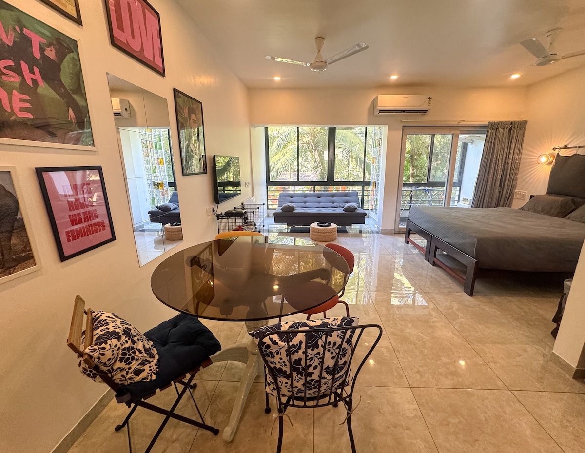 This tastefully decorated Studio Villa nestled in Cavelossim features a large living room with a double bed and a kitchen. The studio room is outfitted with all the appliances you need including a fridge, TV, microwave and air-conditioning with back up power. A cozy sit-out is also there outside to enjoy your evening coffee with a book. There are sun beds on the lawn for endless reading and sunbathing. We have 2 swimming pools in the community that you can use.