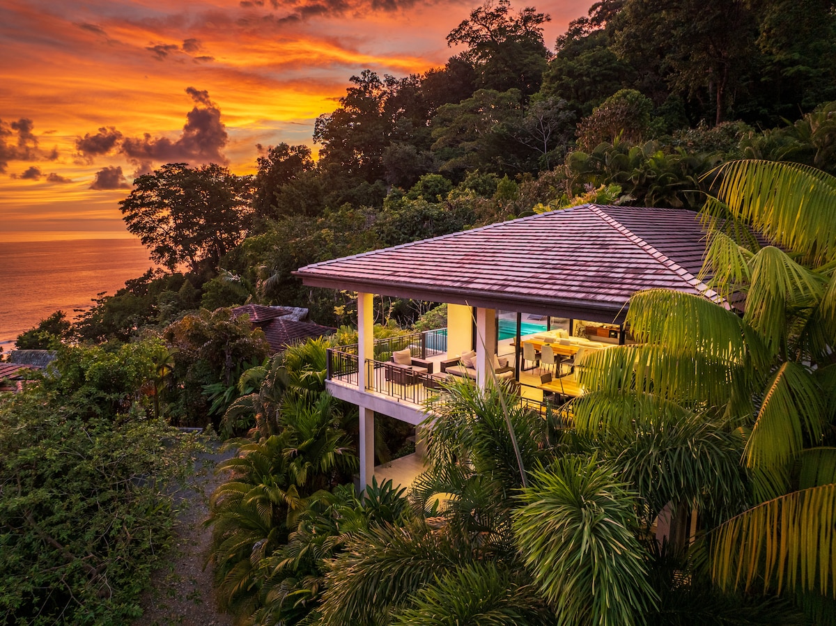 A truly unique place to stay! Dream getaway for couples! The Lookout sits on a privileged location: a stone throw away from the edge of a cliff, overlooking the stunning coast of Quepos / Manuel Antonio, and surrounded by nature, with daily visits from local wildlife. You will enjoy dramatic ocean and sunset views from the ample glass windows and the cozy outdoor areas with plenty of sitting space. All modern comforts are in place, including an outdoor 15 jets hot tub! SUV vehicle recommended.