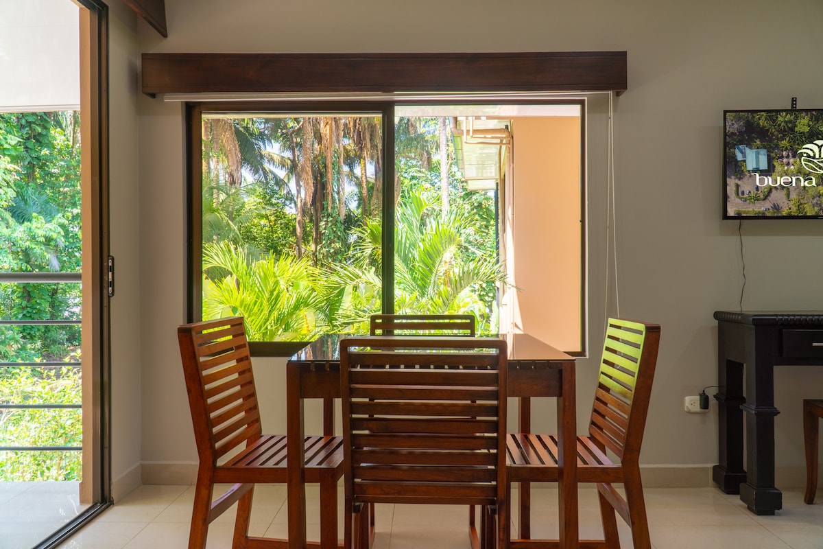 We offer an amazing room, free breakfast, free park tour(tickets not included) Relax in this queen studio featuring a living area, full kitchen, walk-in closet, and private bathroom. Step outside to a shared pool surrounded by lush nature, where monkeys swing through the trees and toucans call from above—wildlife sightings are part of the experience! Start your day with a complimentary Costa Rican-style Gallo Pinto breakfast.
