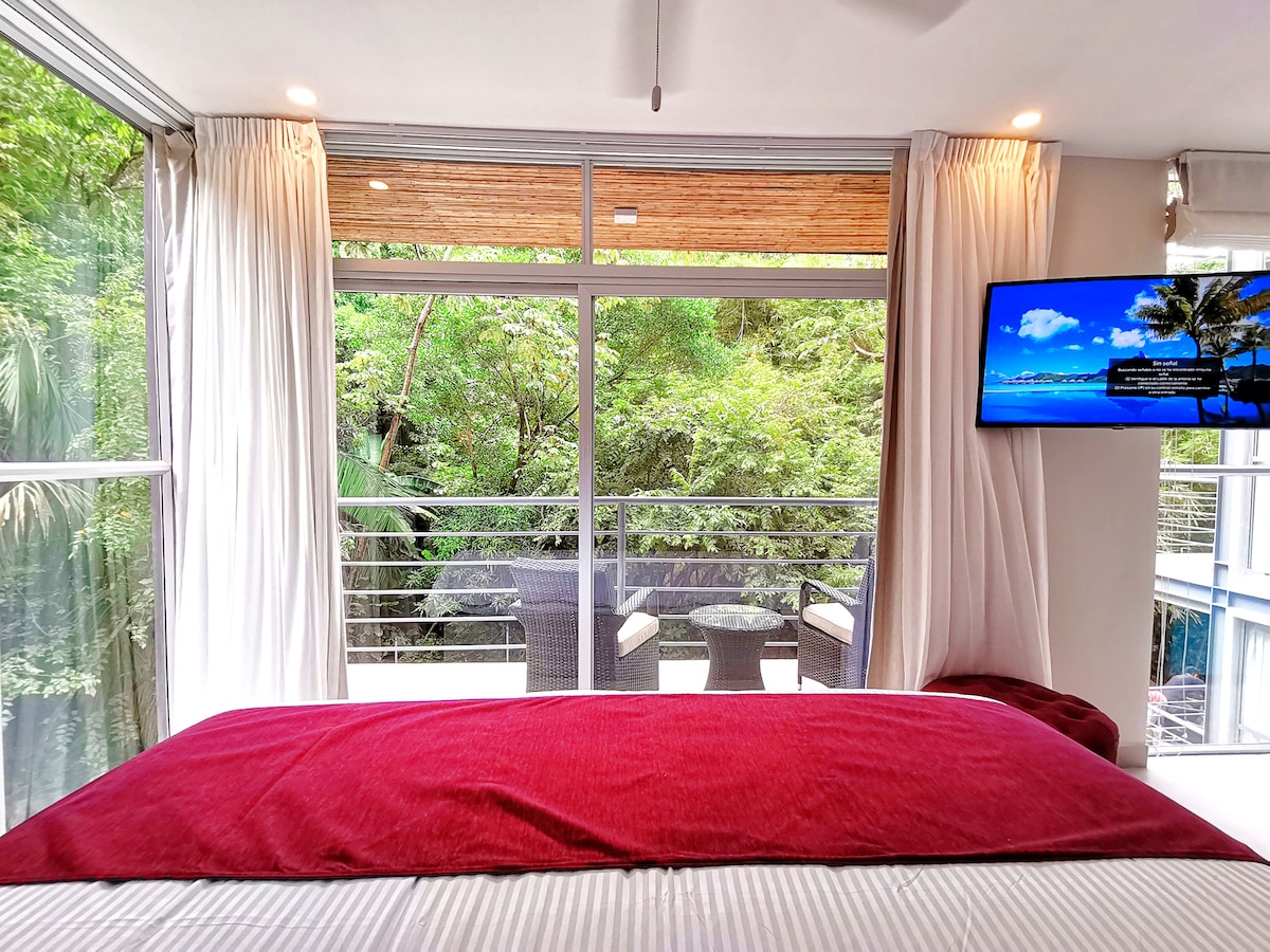 Beautiful studio conveniently located close to town With 1 King bed it can comfortably accommodate 2 adults Offering a modern design, luxury furnishings, and amenities these brand new suites will be a perfect home base during your stay in Manuel Antonio These suites feature large windows and lots of natural light with astounding views, plus a balcony overlooking the rainforest and pool area, private bathroom and shower with heated water, silent A/C, smart tv 43", cable TV, and elevator access