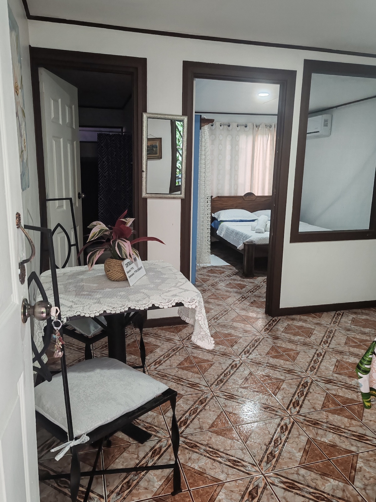 This is a private studio apartment and not just a room. It has a kitchen, full bath, living room/dining area, A/C, TV, WiFi and a shared swimming pool. There is a queen size bed and we add a single bed at additional cost for the third guest. In case this apartment is booked take a look of our listing in Casa Pargo we have 6 unit very comfortable. Surrounded by mother nature and amazing views.
