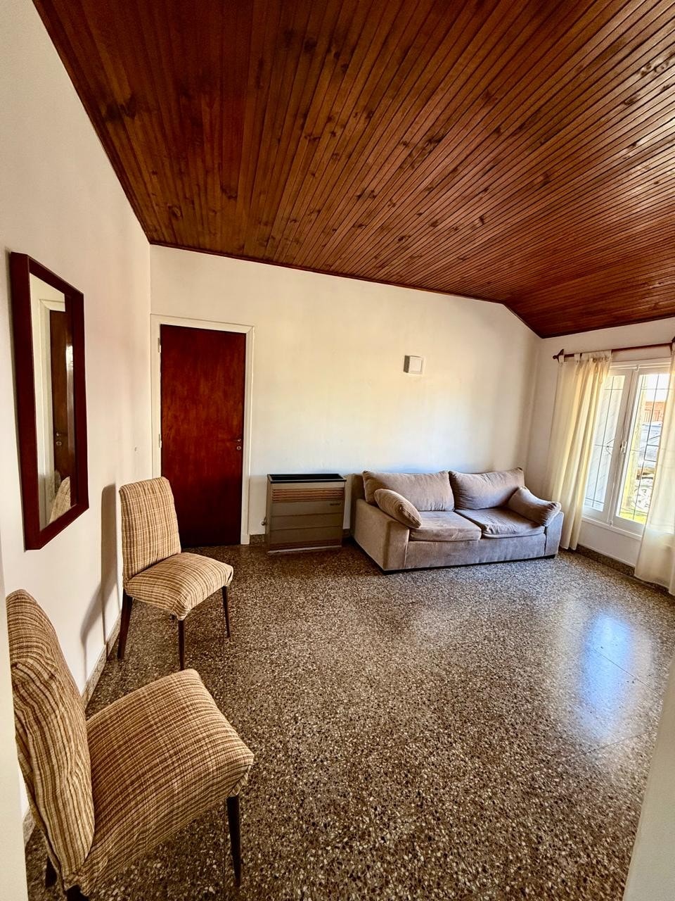 Beautiful 2 bedroom house, metres away from the ocean, the beaches and the golf course of Quequen. Large backyard where children can play, terrace where to enjoy a family and friends barbecue, and a small rooftop where to enjoy sunset drinks and the ocean view. In the main level there is the dining-living room, with an integrated kitchen and a small bathroom. In the second level there is the main room with a king sized bed, a large second room with two singles beds, and the main bathroom.