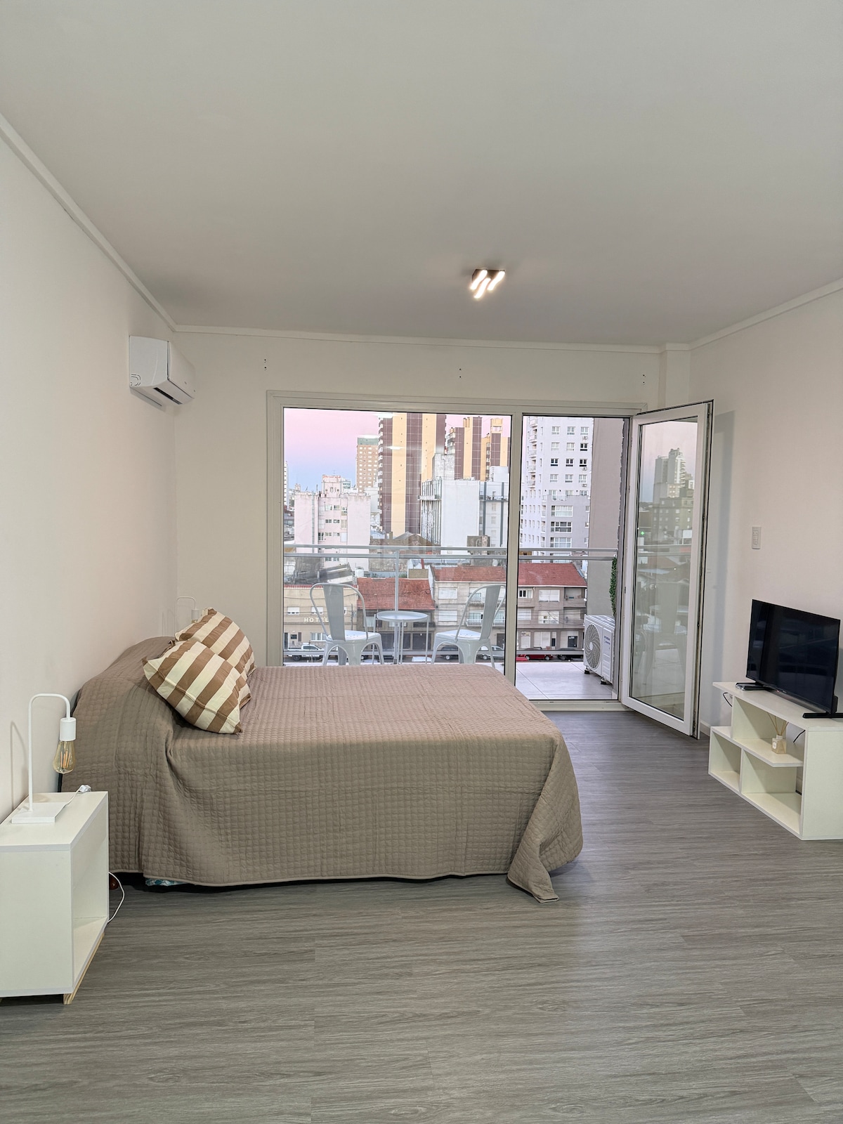 Studio moderno con comodidades para hasta 4 huéspedes a dos cuadras de la playa y frente al parque. Cuenta con un Sommier queen size y un sillón grande con carrito debajo. Anafe, horno, heladera con frizzer, y espacios de guardado con utensilios de cocina, vajilla y todo lo necesario para cocinar Ropa de cama y toallas incluídas. Baño con ducha, calentador de toalla, inodoro y bidét. El edificio cuenta con solárium, pileta (climatizada y techada cuando el mal tiempo lo requiere) y cafetería
