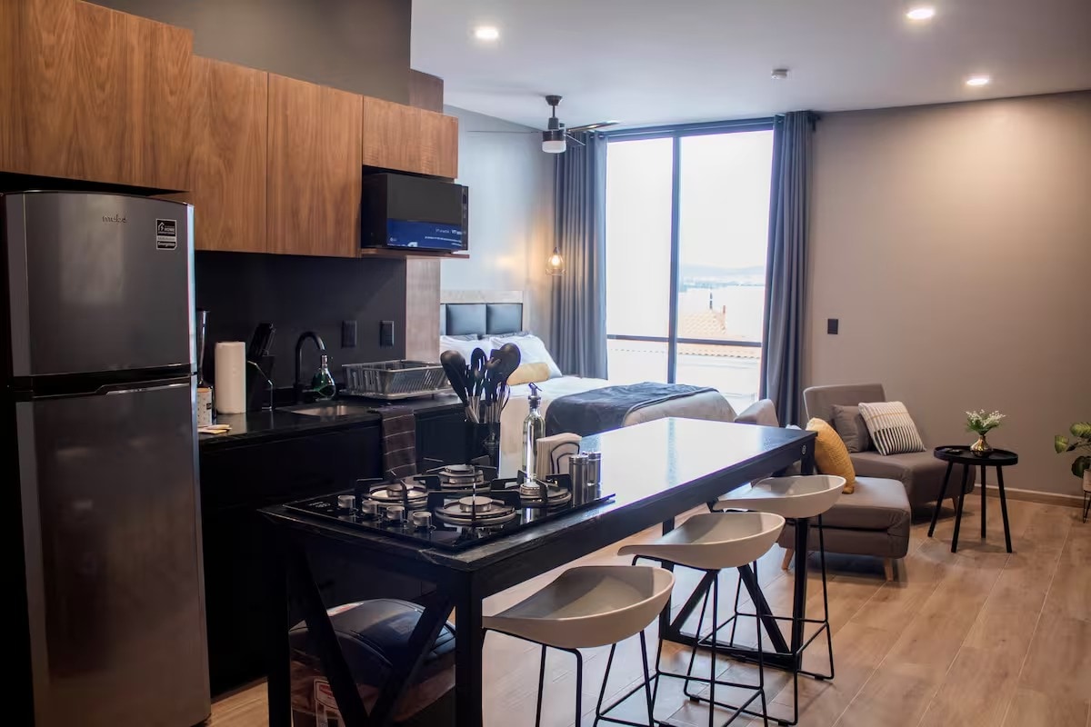 Beautiful suite Boutique concept furnished with antique touch but fully equipped. Heart of the historic center. Beautiful apartment located on pedestrian street in the best location in downtown w/ amazing private rooftop terrace. The apartment sleeps 2 people is fully equipped with private bathroom, kitchen and dining area. Walking distance to everywhere in downtown Queretaro. The place is clean quiet and full of design. Nice terrace Safe box Bathroom Queen size bed Dining room Living room 49