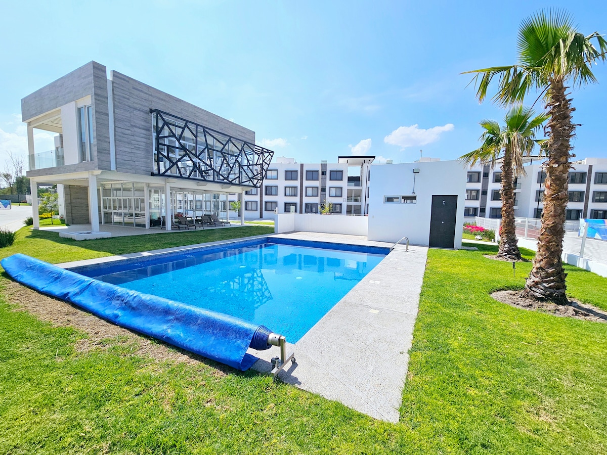 Comfortable and stylish apartment with a cheerful style. It has all the amenities of a luxury apartment such as a pool, roof garden, childrens playroom, business center, private parking, 24/7 vigilance and a gym. Enjoy the new chic area of Querétaro, with the best view of the natural reserve "El Tángano" and of the city. Very close to the bus terminal, the highway to Mexico City and the exit to the International airport. Important to confirm the number of guests.