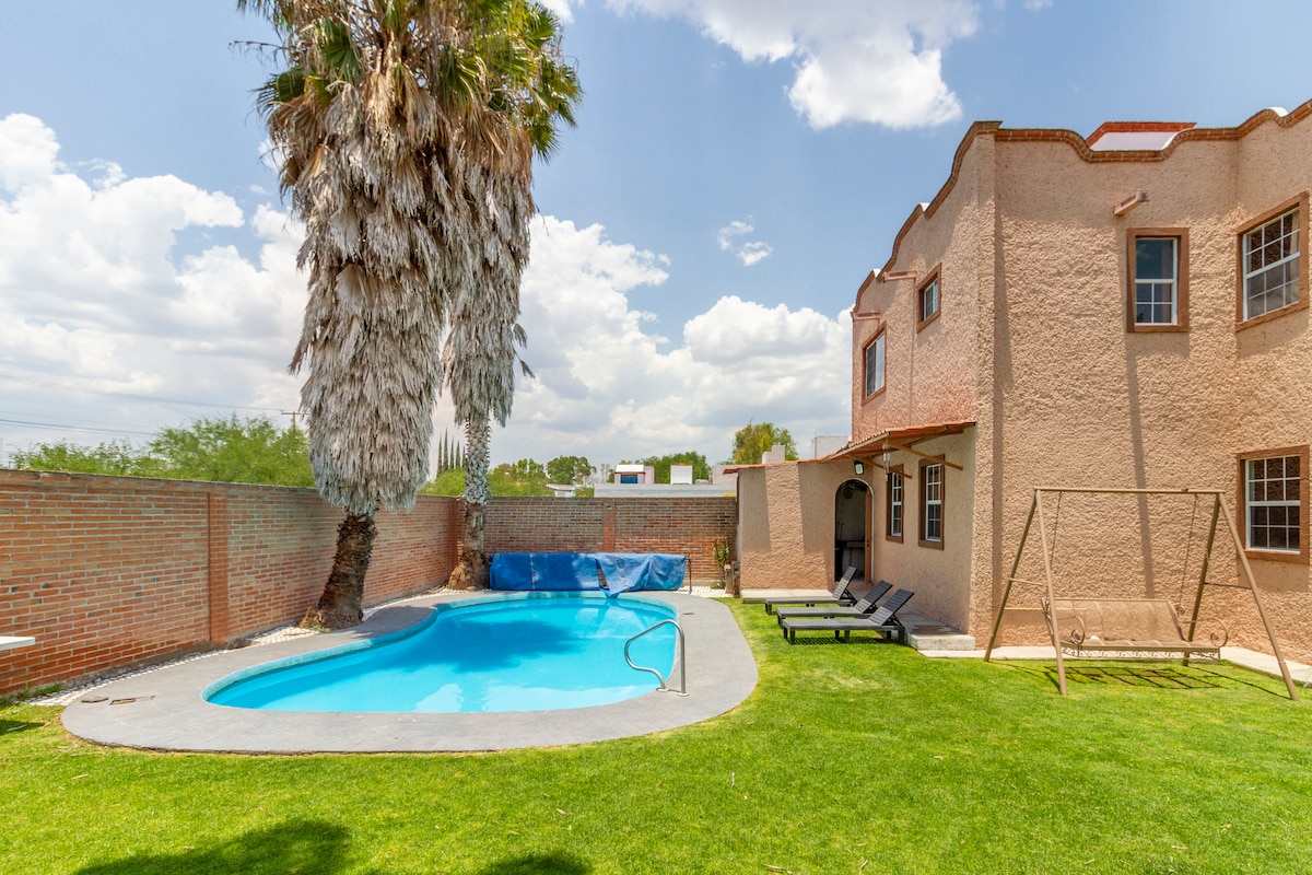 Increíble casa estilo colonial, estancia para 8 personas, cuenta con 4 recámaras (con 1 cama matrimonial cada una, mas sofá cama en 2 de ellas), 2 baños completos, cocina equipada, patio de servicio, sala, comedor, chimenea, asador, jardín, estacionamiento, alberca climatizada con celdas solares, tv y wi-fi. La mejor opción para nadar y disfrutar al aire libre sin entrar en contacto con más personas, cuenta con vigilancia dentro del fraccionamiento las 24 hr.