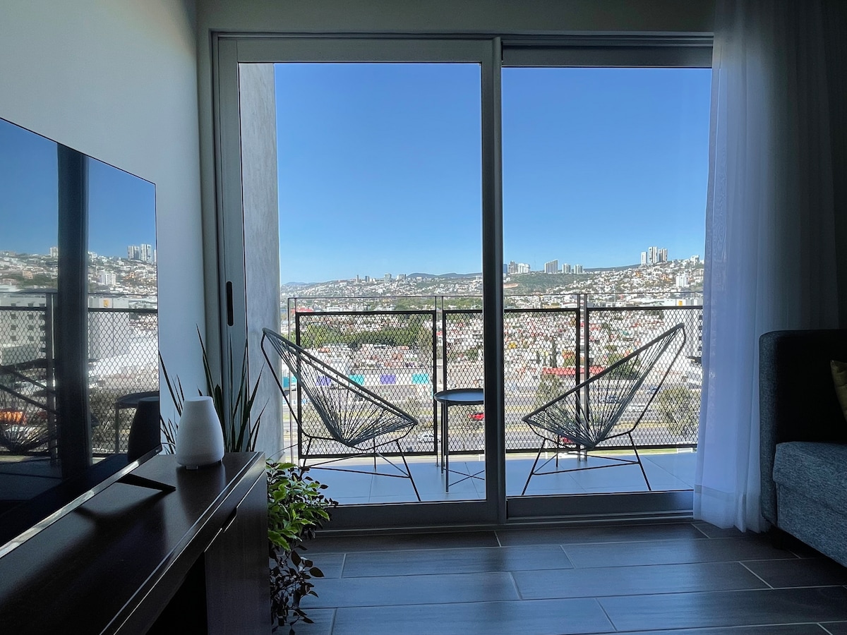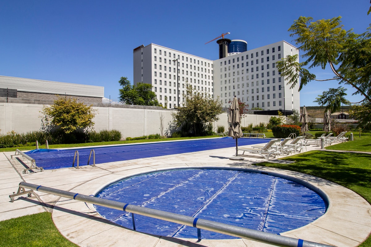 Comfortable and stylish apartment with a cheerful style. It has all the amenities of a luxury apartment such as a pool, roof garden, childrens playroom, business center, private parking, 24/7 vigilance and a gym. Enjoy the new chic area of Querétaro, with the best view of the natural reserve "El Tángano" and of the city. Very close to the bus terminal, the highway to Mexico City and the exit to the International airport. Important to confirm the number of guests.