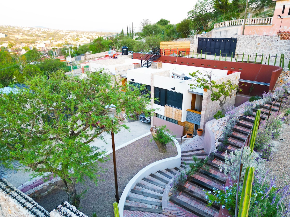 El mejor lugar para quedarte en el pueblo mágico de Bernal es nuestra lujosa suite. Cuenta con un diseño minimalista que mezcla los materiales y la flora caracteristicos de la región para lograr un ambiente agradable que siempre estará enmarcado por la Peña de Bernal, ya que fue orientada para tener las mejores vistas del monolito. Nos encontramos en el centro de la ciudad, es perfecto para moverse caminando, y contamos con vigilancia a todo momento.