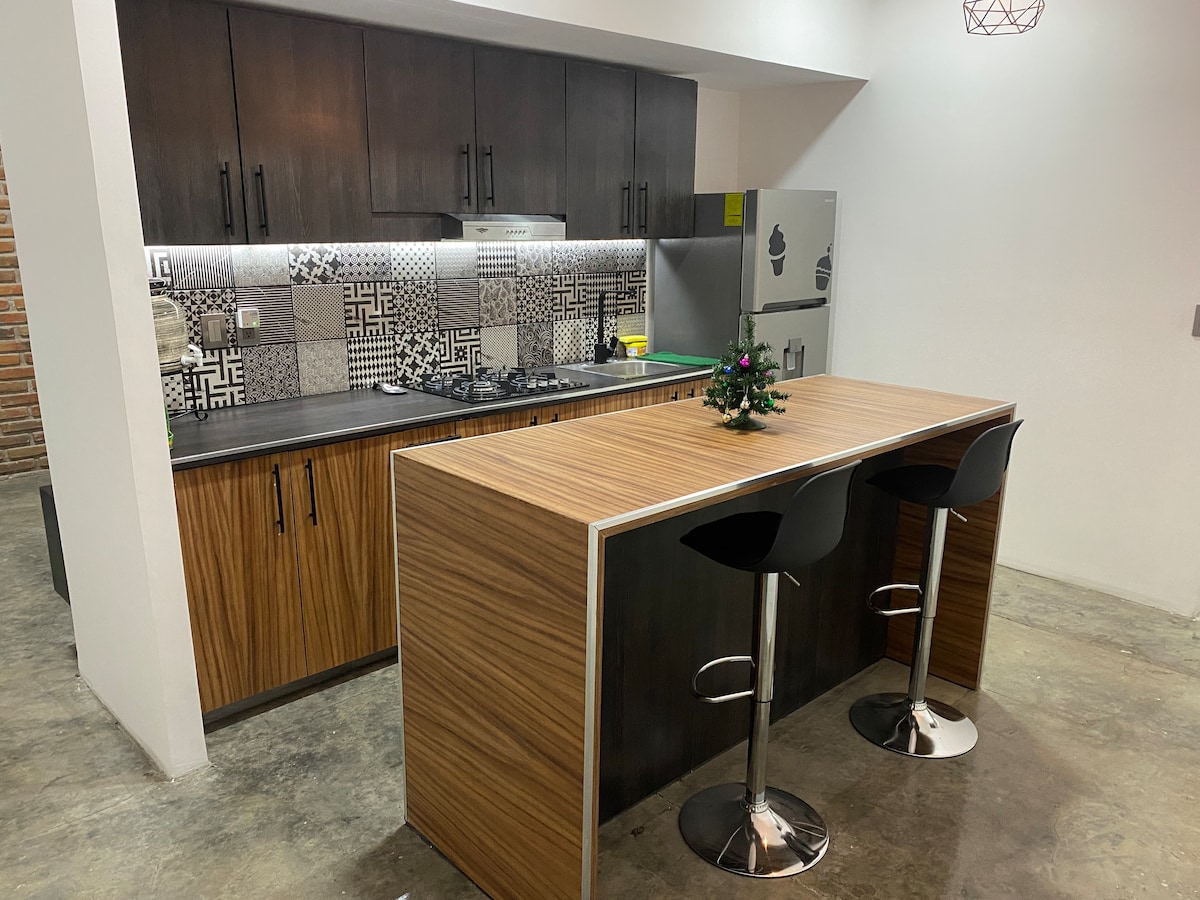 Hermoso Departamento con amplia terraza, limpio y muy acogedor. la construcción es nueva, así como los muebles que hay en su interior. el departamento es de concepto abierto, solo hay un biombo que separa el área del dormitorio con la sala, para dar un poco de privacidad. Hay un sofá cama, tamaño matrimonial, en la sala El departamento tiene amplias ventanas que brindan una excelente iluminación. y cuenta con una linda terraza, rodeada de plantas.