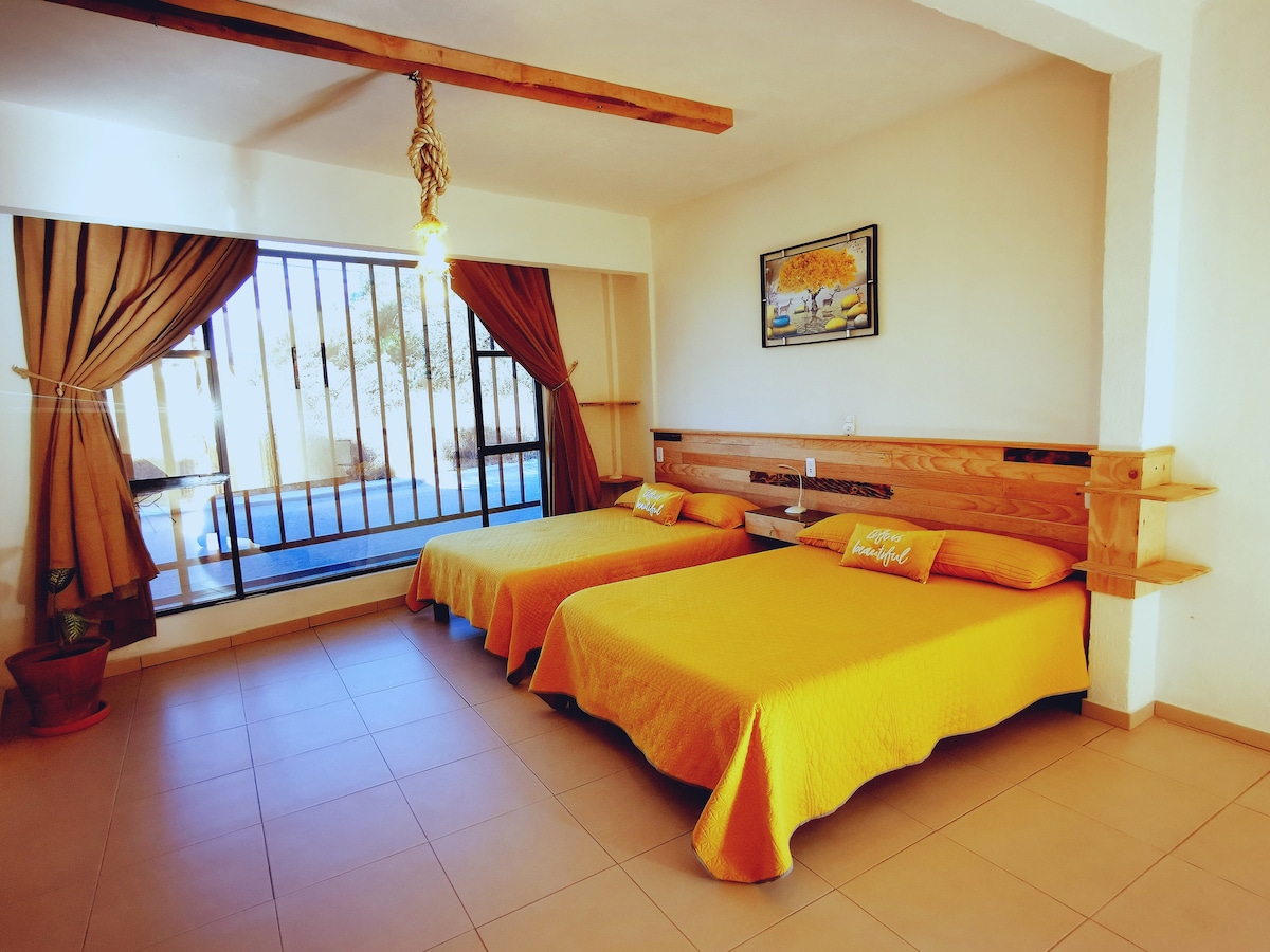 Se encuentra en planta alta, solo accesible por escaleras (no apta para minusválidos). Una recámara con 2 camas individuales y un sofá-cama, otra recámara con cama queen size; cocina con desayunador y refrigerador, un baño con regadera, secadora de cabello, plancha y amenities.- Cupo: 4 personas. NOTA: El baño completo se encuentra dentro de la recámara con cama queen size.