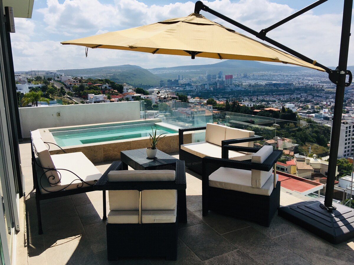Our apartment has a large terrace with a splendid view all over Queretaro! It has 2 floors, the first one has 3 nice bedrooms and the second one has a large living room and an open kitchen with access to the terrace. All spaces are bright and modern. Queretaro's historic center or downtown is just around 10 mins by car! Really safe and calm zone. (Security guard at the entrance of the street)