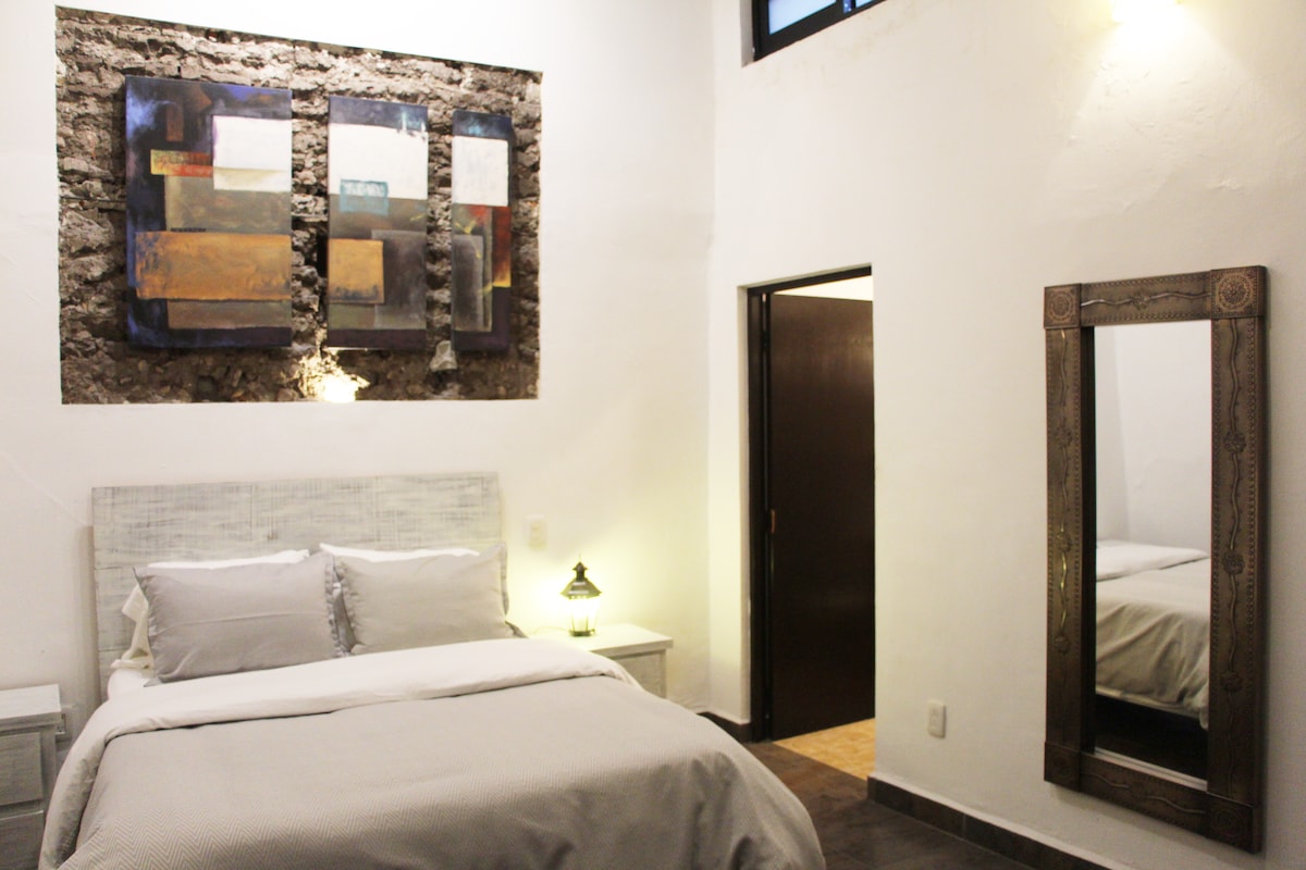 We invite you to experience comfort and privacy in our rustic-modern Studio! Integrated within an old mansion in the historic center of Querétaro, just a few blocks away from the cathedral and the historic Teatro de la República, our location is privileged in the heart of the city, in a peaceful area away from nighttime noise. Come and enjoy an unforgettable stay!