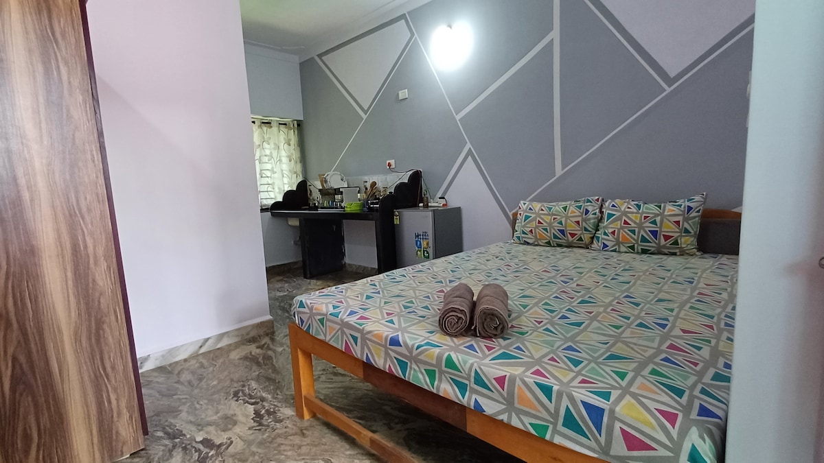 This cozy studio near Ashvem quarries is nestled in a tranquil jungle village. Just 5 minutes from Ashvem Beach and Mandrem Beach, and 2 minutes from Mandrem Quarries, it offers the perfect blend of serenity and convenience. Located in a quiet neighborhood, the studio is also close to local restaurants, making dining out easy and enjoyable. It features an ensuite bathroom, a fully equipped kitchenette, internet access, and a balcony. The comfortable bed is ideal for solo travelers or couples.