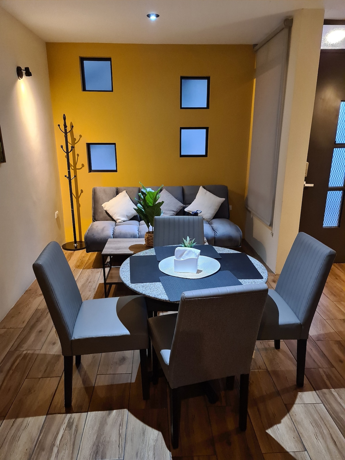 Disfruta de la comodidad de este alojamiento tranquilo e independiente, frente a Interplaza Xela. Puedes descansar o trabajar en sus ambientes en soledad o con más personas, cuenta con una cocineta equipada, comedor para 4 personas, sala (sofá cama) con entretenimientos (T.V. de 43", Wifi, Netflix y juegos de mesa) y dormitorio con una cama king size, escritorio, closet y un cómodo baño con agua caliente. Estacionamiento gratuito seguro y hasta 4 vehículos.